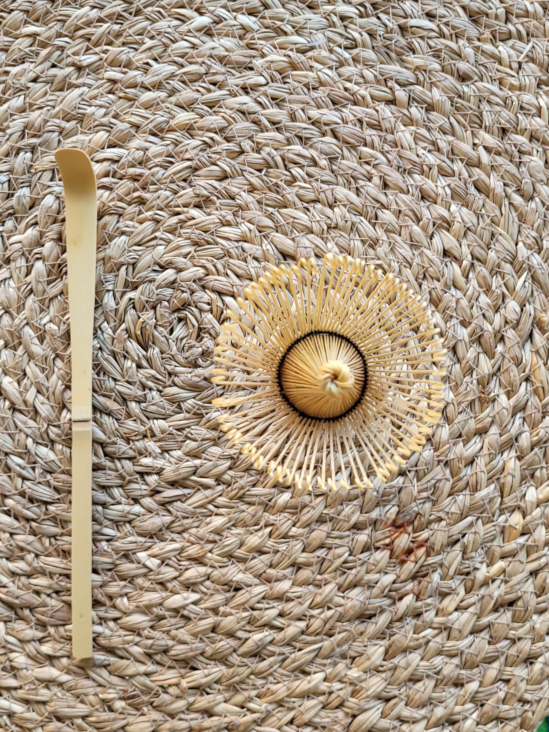 1. Usa la cuchara de bambú (chashaku) para medir la cantidad exacta de matcha en tu tazón.