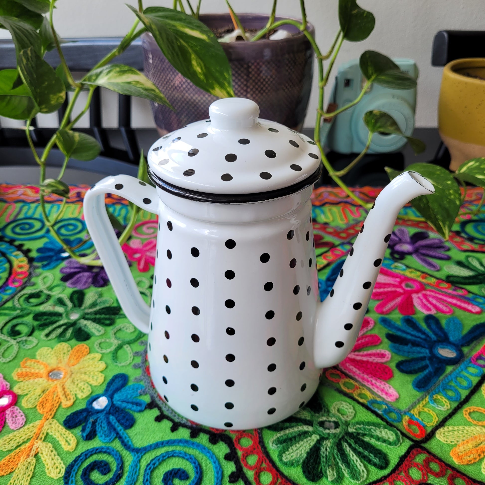 Tetera Enlozada, Diseño Color Blanco con Lunares Negros